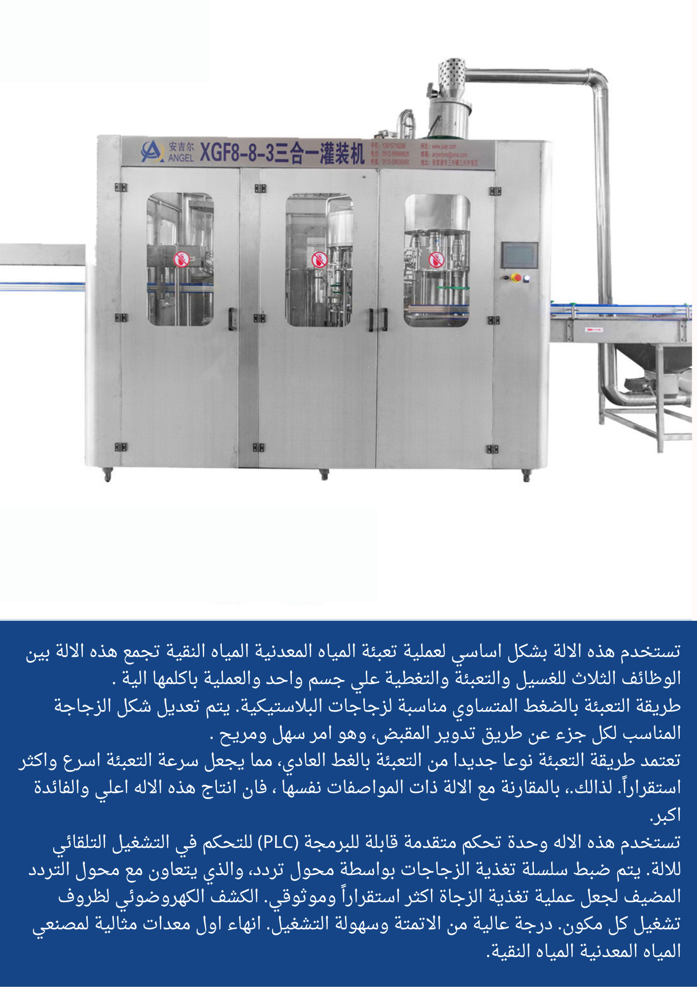 XG8-8-3 آلة تعبئة واحدة في ثلاثة تستخدم بشكل أساسي لعملية تعبئة المياه المعدنية . مجموعة من بين الوظائف الثلاثة للغسيل والتعبئة والاغلاق على الجسم الواحد، وبرمجتها برمجتها الممتعة. هذه الحل الأمثل لزجاجات البوليستر والزجاجات البلاستيكية. يتم تعديل شكل الزجاجة بشكل معقول لكل جزء من طريقة المقبض، وهي أدوات سهلة وبسيطة وسريعة. تعتمد الطريقة الدائمة الجديدة على التمرين العادي، مما يجعل السرعة أسرع وأكثر راحة. لذلك، فإن المقارنة مع الماكينة من نفس المواصفات، هي نتيجة لهذا الجهاز الأعلى والفائدة الأكبر. تعتمد هذه المشكلة على وحدة تحكم متقدمة قابلة للبرمجة (PLC) للتحكم في التشغيل التلقائي للماكينة. تعتمد سلسلة الزجاجة على محول التردد للضبط، وتتعاون مع محول التردد الترددي لإصدار الزجاجة أكثر استقرارًا بشكل موثوق. تشخيص الكهروضوئي لظروف العمل لكل خلق. درجة عالية من التخفيضات في التصفيات. تعتبر معدات مثالية لصانعي الأسلحة المعدنية البحرية.